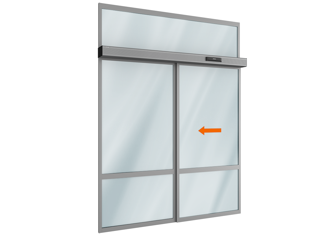 - Решение для высоких проемов: Верхняя неподвижная фрамуга позволяет гармонично вписать дверь в высокий проем, сохранив при этом стандартную и удобную высоту подвижной створки. Это обеспечивает стабильность работы привода и эстетичный внешний вид всей конструкции.