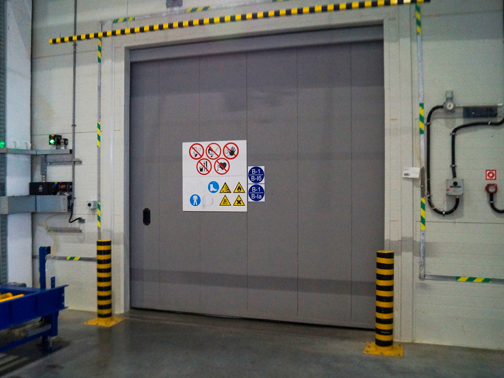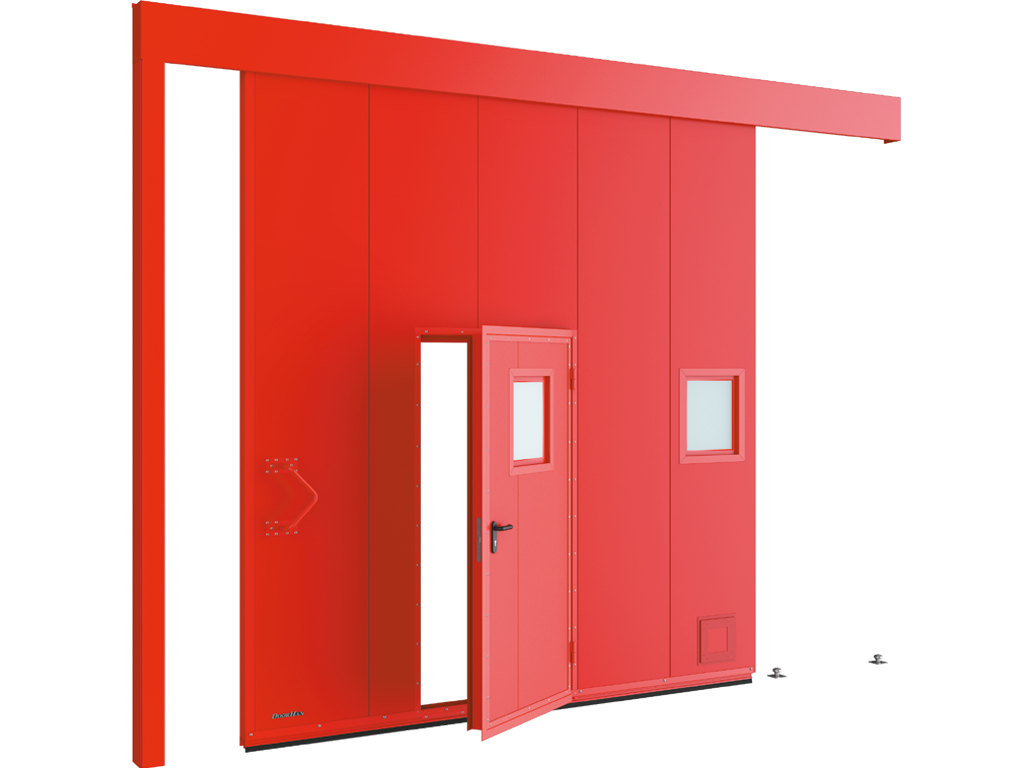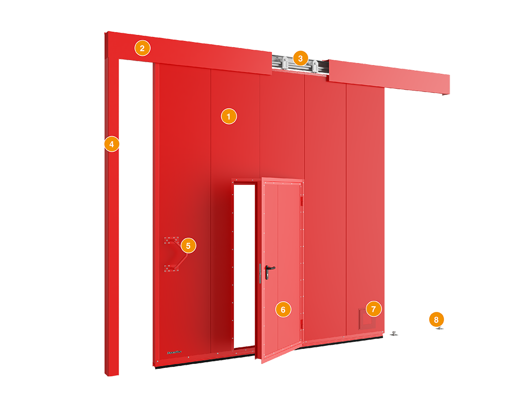 Yong'inga qarshi eshiklar yong'inning va yonuvchi mahsulotlarning tarqalishini to'xtatib, shu bilan birga muhim qarorlar qabul qilish uchun zarur bo'lgan vaqtni oshiradi. DoorHan yong'inga qarshi o'tkaziladigan eshiklari Rossiyaning qurilish standartlariga to'liq javob beradi va moslik sertifikatlariga ega. Ikki eshikli o‘zgartirilgan eshiklarning tuzilishi: 1) navesli rolikli oporalarga ega nurlik; 2) eshik varaqasi; 3) integratsiyalangan kalitka; 4) himoya qutisi; 5) tutqich; 6) pastki yo'naltiruvchi rolik.