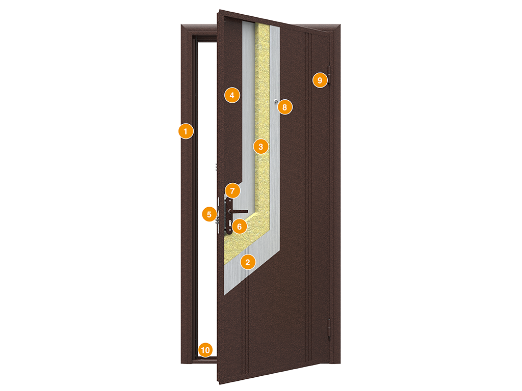 - Samarali isitgich: Polotnoning ichki bo'shlig'i yengil va samarali isitgich — penopolistirol bilan to'ldirilgan. U namlikni singdirmaydi, mog'or paydo bo'lishiga moyil emas va ajoyib issiqlik va ovoz izolyatori hisoblanadi. Sizning eshigingiz nafaqat chaqirilmagan mehmonlardan, balki zinapoya maydonchasidan keladigan sovuq va shovqindan ham himoya qiladi.